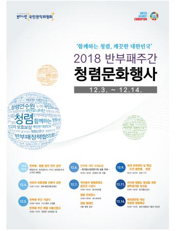 유엔이 지정한 ‘세계 반부패의 날’을 맞아 오는 12월 3일부터 14일까지 ’반부패 주간‘으로 지정돼 국민과 함께하는 다양한 청렴문화행사가 열린다.