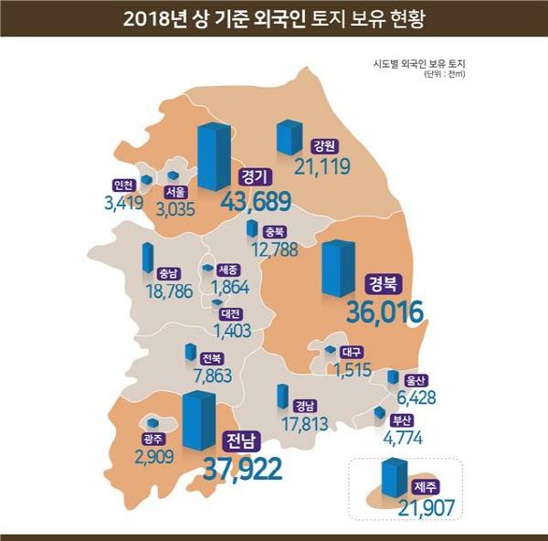경기도가 전년 대비 2.3% 증가한 4,369만㎡로 전체의 18.0%로 외국인이 가장 많이 토지를 보유하고 있는 지역이며, 전남 3,792만㎡, 경북 3,602만㎡, 제주 2,191만㎡, 강원 2,112만㎡ 순으로 보유면적이 큰 것으로 나타났다.