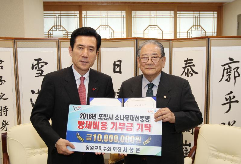 서상은 회장은 “재선충병으로 푸르던 소나무가 그 빛을 잃고 죽어가는 모습이 안타까워 호미수회의 창립정신을 되살리는 의미에서 상금을 기탁하게 되었다”며 “많은 사람들이 재선충으로 피해를 입고 있는 소나무에 관심 가져주기를 바란다”고 전했다. 이강덕 포항시장은 “이번 성금 기탁과 같이 소나무에 대한 시민들의 관심에 부응하고자 2016년 재선충병 방제에 최선을 다 하겠다”고 말했다.