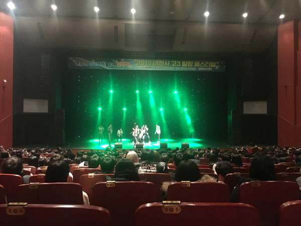 이천시는 지난 29일 이천아트홀 대공연장에서 ‘2018년 고3 힐링페스티벌’을 개최했다. 이번 페스티벌은 수능 준비로 지친 고3 학생들을 격려하기 위해 준비됐으며, 다산고등학교, 마장고등학교, 장호원고등학교, 세무고등학교, 양정여자고등학교, 이현고등학교, 도예고등학교, 부원고등학교 등 8개 고등학교 3학년 학생 1000여 명이 참여했다.