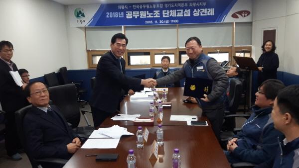 김상돈 시장은“상호 신뢰와 존중을 바탕으로 한 선진적인 노사교섭이 이루어지길 기대한다”며“직원들의 행복한 근무환경 조성과, 나아가 사기진작을 통한 행정서비스 향상으로 시민과 직원 모두가 행복한 의왕시가 될 수 있길 바란다”고 말했다.