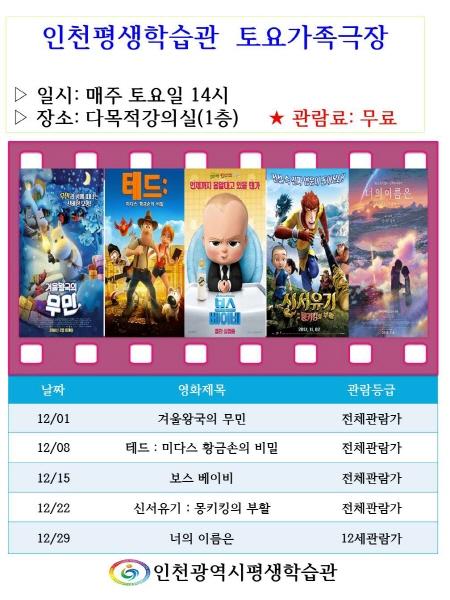 인천평생학습관에서는 가족이 함께 즐거운 주말을 보낼 수 있도록 매주 토요일 오후 2시 다목적강의실에서 무료 영화를 상영하고 있다.