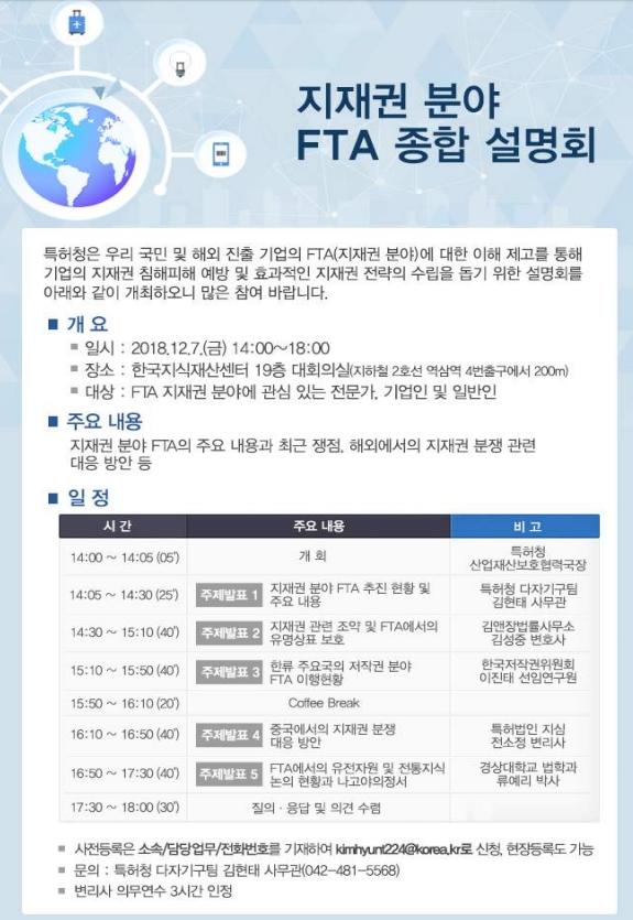 특허청은 한국지식재산센터 대회의실에서 오는 7일 오후 2시에 해외 진출 기업, 전문가 및 일반인을 대상으로"2018년 지재권 분야 FTA 종합 설명회"를 개최한다.