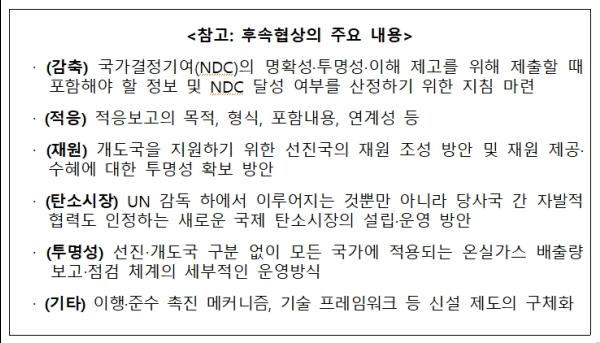 2016년 11월 모로코 마라케시에서 열린 제22차 당사국총회에서는 파리협정 이행지침의 후속협상 시한이 합의된 바 있으며, 2017년 11월 독일 본에서 열린 제23차 당사국총회에서는 파리협정 이행지침의 목차 및 일부 구성요소와 감축, 적응 등 의제별 입장을 취합하여 법적 지위가 없는 비공식 문서가 마련됐다.