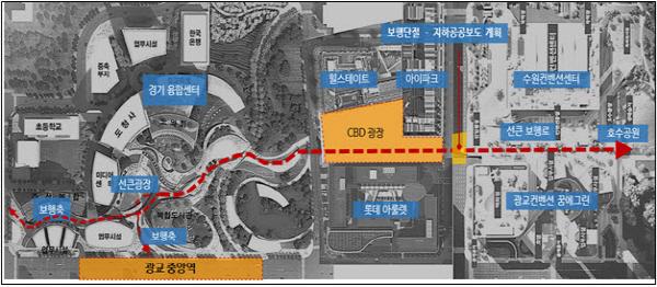 지하연결로는 서쪽으로는 상업지역에서 출발해 경기도 신청사 광장과 중심업무지구를 연결하고, 동쪽으로는 컨벤션센터 열린 광장을 지나 호수공원까지 이어진다. 연결로는 지하2층에 대지면적 11,455㎡, 길이 290m 규모로 약 384억의 사업비가 투입돼 내년 상반기 중에 공사를 착공해 2020년 완공될 예정이다. 도는 지하층에 보행자를 위한 쇼핑, 휴게, 문화 시설과 별도 차량 연결 통로를 조성할 계획이다.