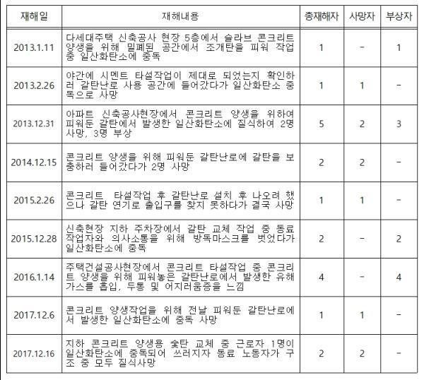 최근 5년간 겨울철에 발생한 질식재해는 총 30건이며 이중 9건이 건설현장에서의 갈탄난로 사용에 의한 것으로 겨울철 가장 많이 발생하는 질식재해 유형이기도 하다.