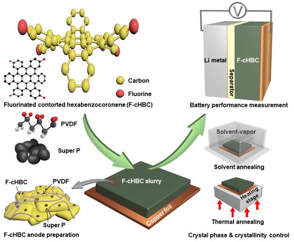 이에 공동연구진은 슈퍼커패시터 저장장치의 새로운 형태의 음극 물질 개발을 위해 휘어진 유기물에 네 개의 플루오린 원자를 결합시켰다.