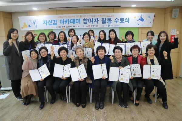 자신감 아카데미는 지역주민의 역량강화를 위해 민간 자격증을 취득할 수 있도록 지원하는 프로그램으로 클레이아트, 동화구연 분야로 진행됐다. 클레이아트 지도자 2급 과정에는 9명, 동화구연 지도자 2급 과정에는 10명의 지역주민이 참여하여 각각 20회기, 10회기 교육을 이수했다.