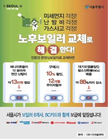 서울시는 국내 6개 보일러 제조사경동나비엔, 귀뚜라미, 대성쎌틱에너시스,롯데알미늄기공사업본부, 린나이코리아, ㈜알토엔대우) 및 금융사와 협력해 친환경콘덴싱보일러로 교체신청시 10% 특별 할인을 제공하고, BC카드 결제 시 12개월 무이자 할부 혜택 등을 제공하고 있다.