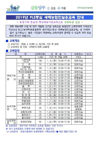 양주시는 내년도 1월 8일부터 1월 31일까지 농업기술센터, 농협 등에서 농업인 등 시민 1천여명을 대상으로 ‘2019년 PLS중심 새해농업인 실용교육’을 실시한다.