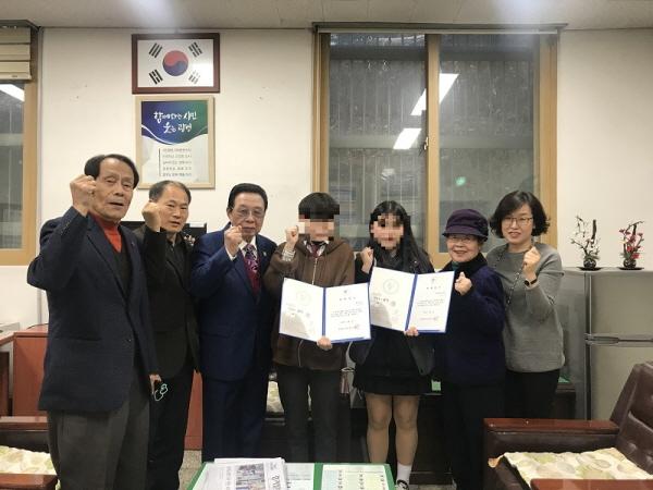 광명시 광명5동 경로당은 지난 4일 관내 한부모가정 학생 2명에게 각 50만 원의 장학금을 전달했다.