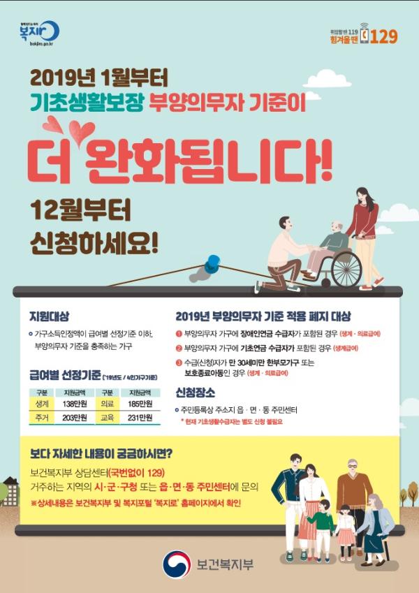 인천 남동구는 ‘제1차 기초생활보장 종합계획’에 따라 오는 2019년 1월부터 기초생활보장 부양의무자 기준을 추가 완화 시행하기로 하고, 지난 3일부터 사전신청을 받고 있다고 밝혔다.