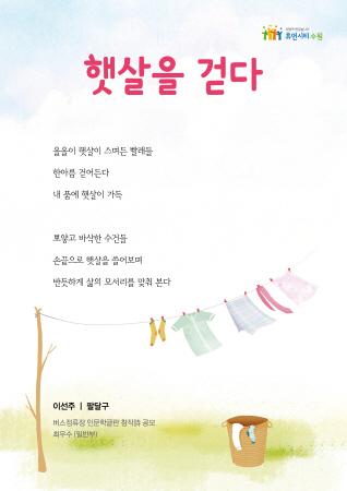 시는 지난 10월 ‘행복한 나눔의 도시, 따뜻한 소통’을 주제로 버스정류장 인문학글판에 게시할 시민 창작시를 공모했다. 응모작 123편 가운데 선정위원회 심사를 거쳐 청소년부 20편, 일반부 10편을 수상작으로 선정했다.