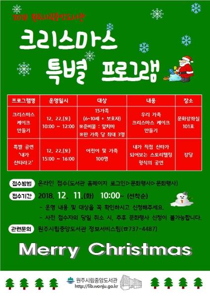 원주시립중앙도서관이 연말을 맞아 오는 22일 크리스마스 특별 프로그램을 운영한다.