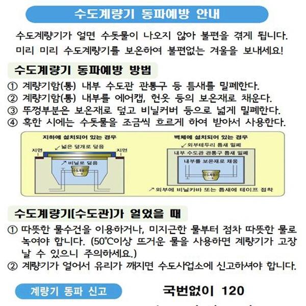 공사장이나 휴일에 영업을 하지 않는 상가에서 계량기 동파가 많이 발생하므로 장시간 물 사용이 없을 경우에는 물을 조금 틀어놓을 것을 거듭 당부 했다.
