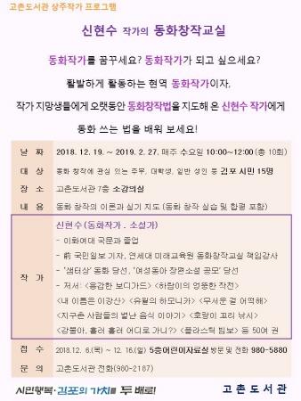 ‘동화창작교실’은 상주작가 프로그램의 시작을 알리는 강좌로 오랫동안 작가 지망생들에게 동화창작법을 지도해 온 신현수 동화작가 겸 소설가가 직접 자신의 노하우를 바탕으로 창작의 이론부터 실습까지 완성해주는 강좌다.
