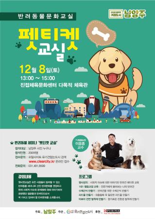 남양주시는 오는 8일 진접체육문화센터 체육관에서 올바른 반려동물 문화정착을 위한 ‘반려동물 문화교실’을 개최한다. 이번 행사는 지난 11월 18일 ‘반려동물 문화교실’개최후 2번째로 행사이다.