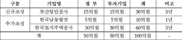 6일, 중소기업중앙회에서 개최된 협약식에서, 부산항만공사는 15억 원, 한국토지주택공사는 30억 원, 한국남동발전㈜은 5억 원을 출연하고, 중기부는 3개 공기업에 1대1 매칭으로 50억 원을 출연하여 총 100억 원의"민·관공동기술개발 투자협약기금"을 조성했다.