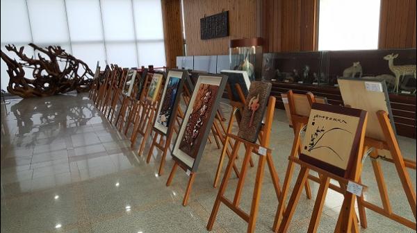 전시회에 출품된 작품은 도청 직장동호회 회원들이 여가를 활용해 창작한 예술작품으로, 나무를 활용한 공예품과 서각 작품 등 총 34점이 전시돼 있다.