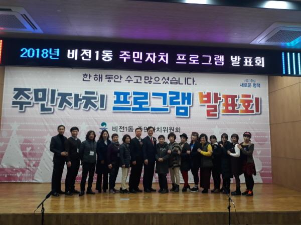 평택시 비전1동 주민자치위원회은 지난 6일 비전1동 행정복지센터 대회의실에서 정장선 평택시장, 각 단체장, 지역주민 등 250여명이 참석한 가운데 주민자치 프로그램 발표회 및 이웃과 행복을 함께 나누는 자리를 마련했다.