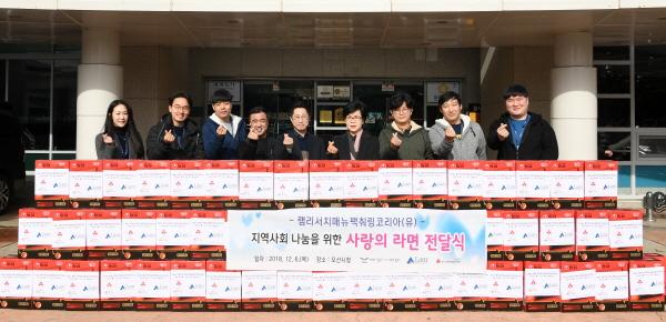 오산시는 지난 6일 오산시 가장동에 위치한 반도체 회사 램리서치 매뉴팩춰링 코리아에서 지역 내 경제적인 어려움을 겪고 있는 저소득층 100가구를 위해 사랑의 라면을 전달했다고 밝혔다.