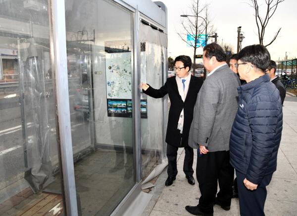 최종환 파주시장은 지난 5일 버스정류장 보온텐트 설치 현장을 방문, 설치 과정을 참관하며 시민들과의 대화를 통해 개선사항을 청취하고 정류소의 구조물을 직접 살피며 구조적 안전 사항과 시민들의 통행불편을 최소화할 것을 당부했다.