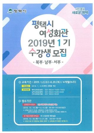 2019년 1기 교육기간은 2019년 1월 2일부터 4월 20일 4개월과정으로 운영되며, 개강일은 1월 2일부터 과목별로 개강한다. 모집과목 등 자세한 사항은 평택시 여성회관 홈페이지에서 확인할 수 있으며, 기타 문의사항은 평택시 여성회관으로 연락하면 된다.