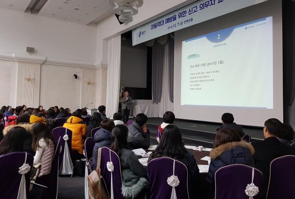 용인시는 7일 시청 컨벤션홀에서 관내 복지업무 담당 공무원과 아동관련 시설·기관 종사자 등 250여명의 아동학대 신고의무자를 대상으로 아동학대 예방과 신고 교육을 했다. 심각한 아동학대 사례가 잇달아 제기됨에 따라 이에 대한 관심도를 높이고, 상황 발생 시 종사자들이 신속히 대처할 수 있도록 하려는 것이다.