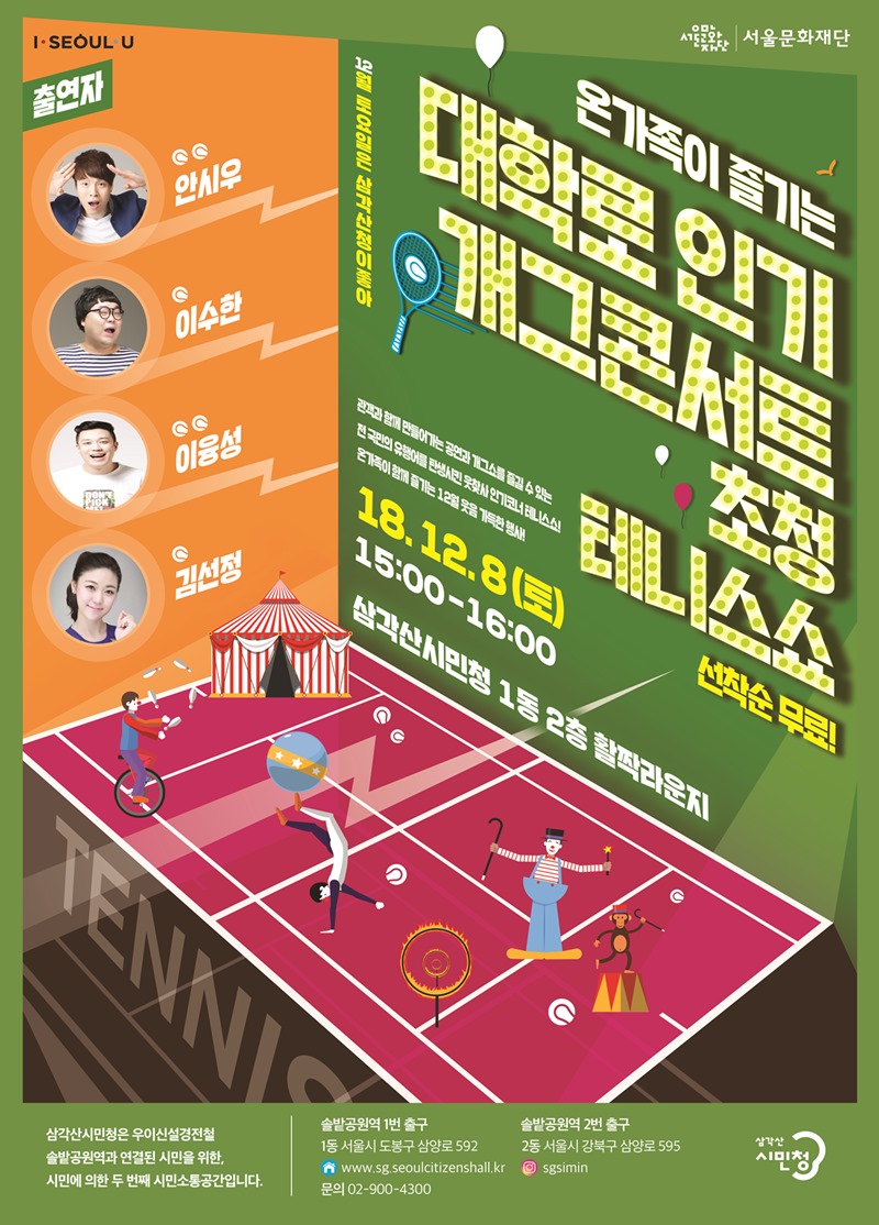 서울문화재단은 오는 8일 오후 3시부터 오후 4시까지 삼각산시민청 1동 2층 활짝라운지에서 대학로 인기 개그공연팀을 초청해 테니스쇼를 선보인다.