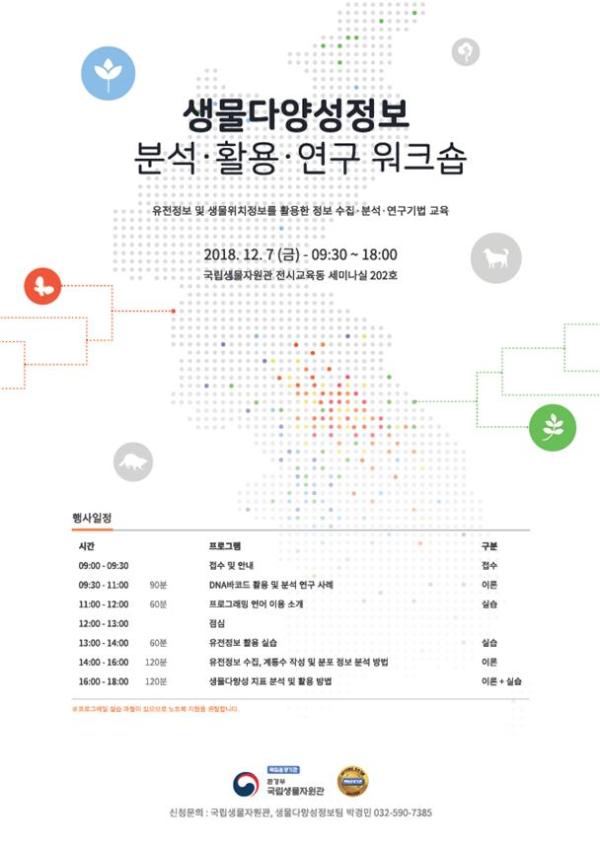 환경부 소속 국립생물자원관은 국공립 및 민간 생물다양성 관리기관의 연구자와 생물다양성정보 활용 연구에 관심이 있는 일반인을 대상으로 '생물다양성 정보 분석·활용·연구 워크숍'을 7일 인천 서구 국립생물자원관 전시교육동에서 개최한다.