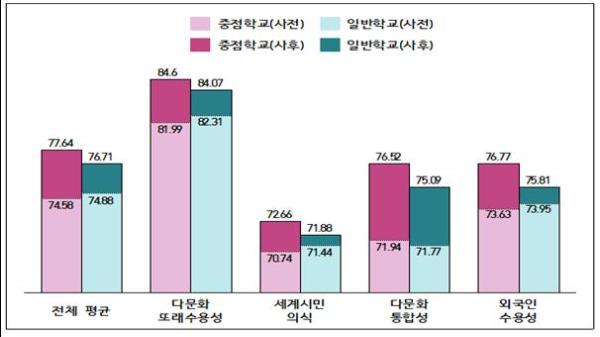 017년 사전조사에서는 다문화 중점학교가 일반학교보다 다문화 수용성 점수가 낮았으나, 2018년 사후조사 결과 다문화 중점학교가 일반학교보다 더 높은 수치를 나타내었다.
