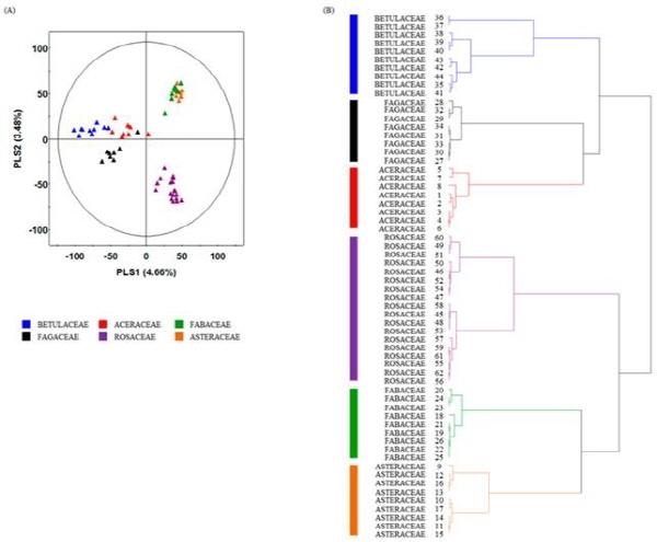 특히, 퀸산, 갈릭산, 쿼세틴 유도체 , 캠페롤 유도체 등 13개의 물질은 단풍나무과, 자작나무과, 참나무과에서 다른과 에 비해 상대적으로 높은 함량을 나타냈다. 예를 들어, 카테킨은 국화과, 쿼세틴은 자작나무과, 캠페롤-7-루티노사이드는 참나무과 식물에서 높은 함량을 보였다.