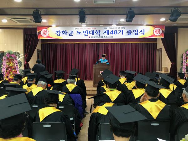 대한노인회강화군지회 부설 강화군노인대학은 지난 7일 강화군노인회관 대강당에서 제48기 노인대학 졸업식을 가졌다. 이날 행사는 유천호 강화군수, 신득상 강화군의회의장, 장기천 대한노인회강화군지회장을 비롯한 각계 기관단체장과 졸업생, 재학생, 가족 등 300여 명이 참석한 가운데 성황리에 개최됐다.