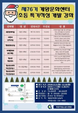“제76기 계양문화센터 초등 특기적성 개발강좌”는 지역 내 초등연령 청소년을 대상으로 오는 12월 한 달간 접수 모집하여 2019년도 1~3월 3개월 과정으로 진행되며 강의시간과 수강료는 과목별 상이하다.