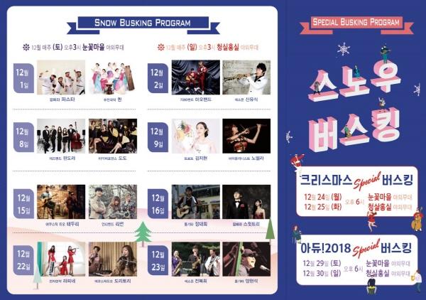 한편, ‘스노우 버스킹’ 행사는, 12월 한 달 동안 매주 토요일은 눈꽃마을 내 야외무대, 일요일은 신포분수대 앞 야외무대에서 오후 3시부터 5시까지 만나볼 수 있다.