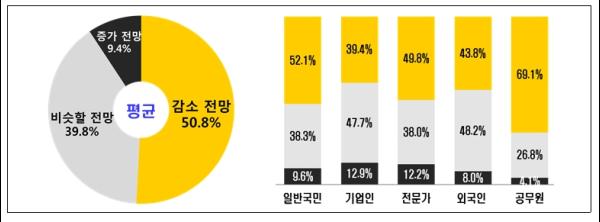 ‘향후 우리사회 부패가 현재보다 줄어들 것’이라는 긍정적 전망은 조사대상 평균 50.8%로 ‘현재보다 부패가 늘어날 것’이라는 부정적 전망 보다 월등히 높았다.