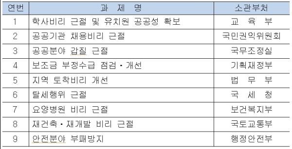 이를 위하여 대국민 소통창구인 국민신문고, 국민생각함, 110콜센터 및 반부패민관거버넌스인 청렴사회민관협의회 등을 통하여 국민 의견을 적극적으로 수렴하는 한편, 과제별 추진상황을 정기적으로 점검하고, 향후 대국민 보고와 평가 등을 통하여 소관 부처들이 책임감을 가지고 추진하도록 할 예정이다.