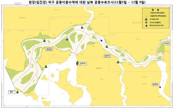한강하구 남북 공동수로조사는 1953년 정전협정 이후 처음으로 시행되는 의미 있는 조치로, 지난 ’제10차 장성급군사회담‘에 따라 남북 수로전문가 각 10명이 우리 조사선 6척에 탑승하여 수로측량을 실시하였으며 선박이 항해할 수 있는 물길을 찾아냈다.
