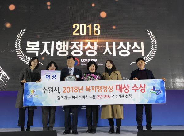수원시가 ‘2018 복지행정상’에서 ‘찾아가는 보건복지서비스제공’ 부문 대상을 받았다. 시상식은 10일 세종시 세종컨벤션센터에서 열렸다.