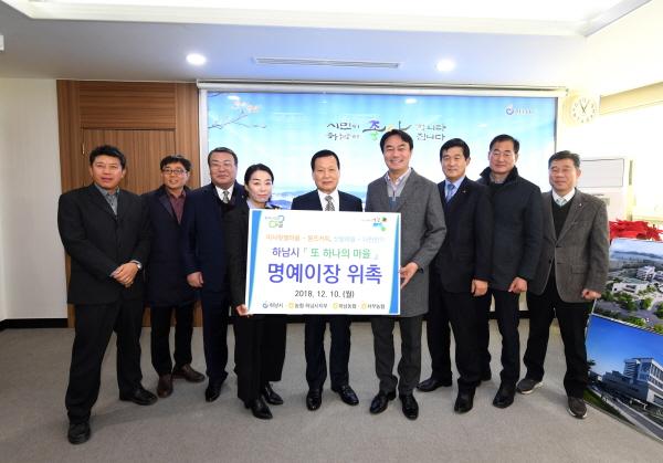 하남시는 10일 ‘또 하나의 마을 만들기’의 일환으로, 하남농협 관내 미사 뒷벌마을과 서부농협 관내 산밑마을 명예이장으로 몽뜨커피 정은아 대표와 다전전기 강상원 대표를 각각 마을 명예이장으로 위촉했다.