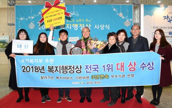 오산시는 10일 정부세종청사에서 열리는 복지행정상 시상식에서 보건복지부 주최 2018년 지역복지사업평가 찾아가는 복지서비스 기반마련 분야에서 3년 연속으로 기관표창을 수상했다고 밝혔다.