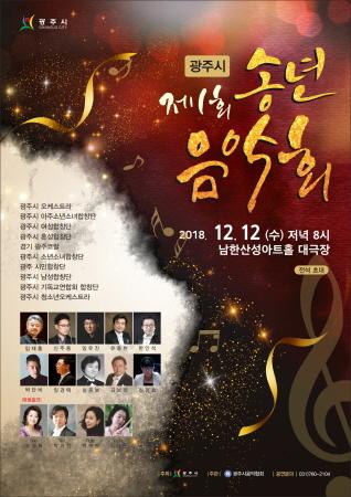 2018년 한해를 마무리하며 시민들에게 뜻깊은 송년의 밤을 선사하고자 기획된 이번 송년음악회는 광주시 오케스트라의 무대를 시작으로 광주시 관내 10개 음악예술단체가 출연한다. 또한, 소프라노 조경화, 테너 박기천, 백수현·정다은의 플루트 협연 등 특별공연을 구성해 다양한 장르의 클래식 공연이 펼쳐질 예정이다.