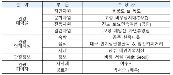 여행의 동기를 북돋거나 여행 관련 정보와 편의를 제공하는 정보 부문에서는 서울의 관광정보를 생생하게 제공하는 서울관광재단의 ‘비지트 서울’이, 한국관광 활성화에 기여한 지자체 부문에서는 지역관광 활성화에 적극적으로 투자하고 노력한 결과, 3년 연속 관광객 연 1300만 명을 유치하고 있는 ‘여수시’가, 공로자 부문에서는 예능 프로그램 윤식당2와 드라마 김비서가 왜 그럴까를 통해 한국을 널리 알리고 한국관광 활성화에 이바지한 한류배우 ‘박서준’ 씨가 각각 선정됐다.