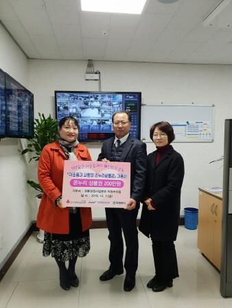 이날 전달식에는 허정석 지점장, 의정부시 지역아동센터연합회 사무국장 김진숙이 참석했으며, 기부된 온누리상품권은 경기사회복지공동모금회에 기탁되어 관내 지역아동센터 26개소에 전달될 예정이다.