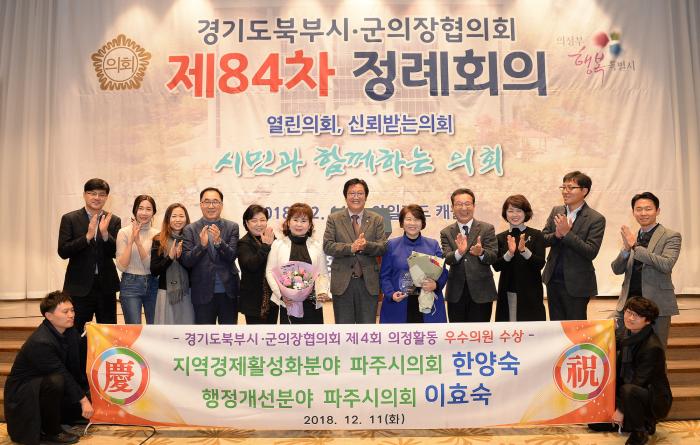 파주시의회 한양수·이효숙 의원이 11일 의정부 아일랜드캐슬에서 열린 경기도 북부시군의장협의회 주관 제4회 의정활동 우수의원 시상식에서 우수의원을 수상했다.