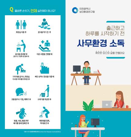 인천시 보건환경연구원은 사무환경 내 주로 손으로 만지고 접촉하는 부분을 대상으로 미생물 오염도를 조사한 결과 각종 오염지표세균 및 병원성 세균이 검출되어 정기적인 소독이 필요하다고 밝혔다.