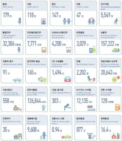 서울의 하루는 어땠을까? 하루 평균 179명이 태어나고, 118명이 사망했다. 147쌍이 부부가 됐고, 47쌍의 부부가 이혼했다. 777만명이 지하철을, 420만명이 버스를 이용했으며, 교통사고로 0.94명이 사망했다.