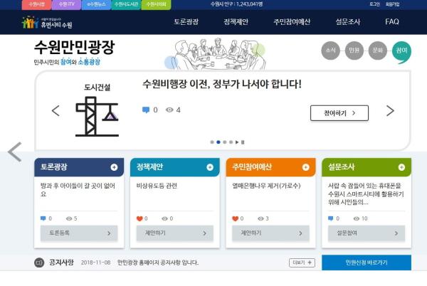 수원만민광장은 토론광장, 정책제안, 주민참여예산, 설문조사 등 네 가지 메뉴로 이뤄져 있다.