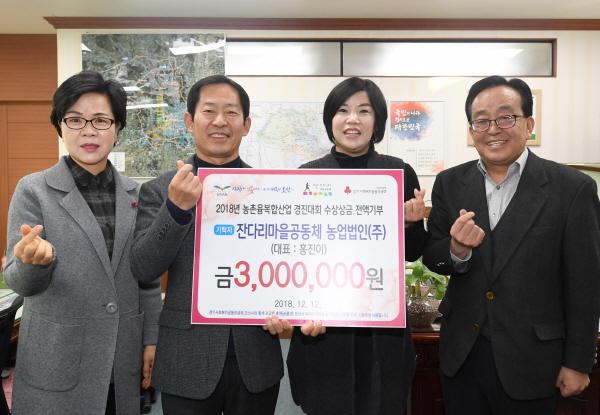 오산시는 12일 잔다리마을공동체 농업법인에서 2018년 농촌융복합산업 경진대회 우수 상금 300만원을 오산시 저소득층을 위해 사용해 달라며 시에 전액 기부했다고 밝혔다.