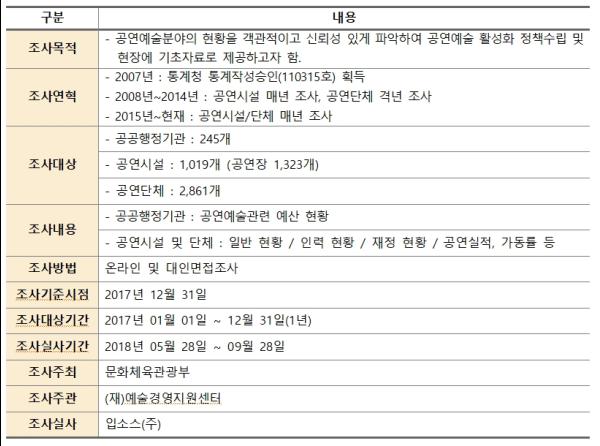 국가승인통계 113015호 ‘2018 공연예술실태조사’는 2018년 5월부터 9월까지 공연시설과 단체·기획사를 대상으로 온라인 및 대인면접조사를 통해 실시됐다. 표본오차는 95% 신뢰수준에서 공연시설 ±2.8%포인트, 공연단체 ±2.7%포인트이다.